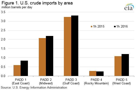 East coast crude oil imports were up the most, rising by 244,000 b/d (41 percent) compared with the first half of 2015. Crude imports increased in all other regions except the Rocky Mountain region.