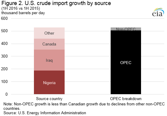 On a national basis, shipments from Nigeria, Iraq, and Canada contributed most to increased imports. Imports from Nigeria, Iraq, and other OPEC members by 504,000 b/d. Declining imports from Mexico, which fell 118,000 b/d, more than offset the increase in imports from Canada, limiting the overall increase of non-OPEC imports to less than 24,000 b/d.