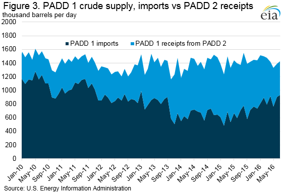 The Rocky Mountain region is the only region with declining imports during the first half of 2016, with volumes down by 24,000 b/d (nine percent). The region is relatively isolated from import infrastructure compared with other regions, and imports have been entirely sourced from Canada for more than a decade, a trend that continued during the first half of 2016.