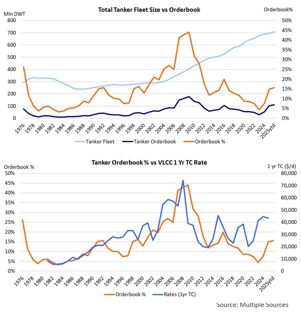 The tanker market has been on a roll in the last few months due to a combination of factors. Increased sanctions (enforcement), resilient oil demand, partly due to stock building in China, and growing OPEC+ supply all contributed to create a rate environment we have not seen since the freight rate boom in the early days of the pandemic. Very limited fleet supply growth, both in 2024 and 2025 has contributed as well. A tightening supply-demand balance has made the freight market more susceptible to small changes in ton-mile demand. The strong cashflows that are being generated in the current freight market has given owners added confidence to look at fleet growth and renewal. In this Tanker Opinion, we will review existing ordering trends to see how they compare to developments in the past. The objective is to determine if current ordering behavior is something that owners should start worrying about.