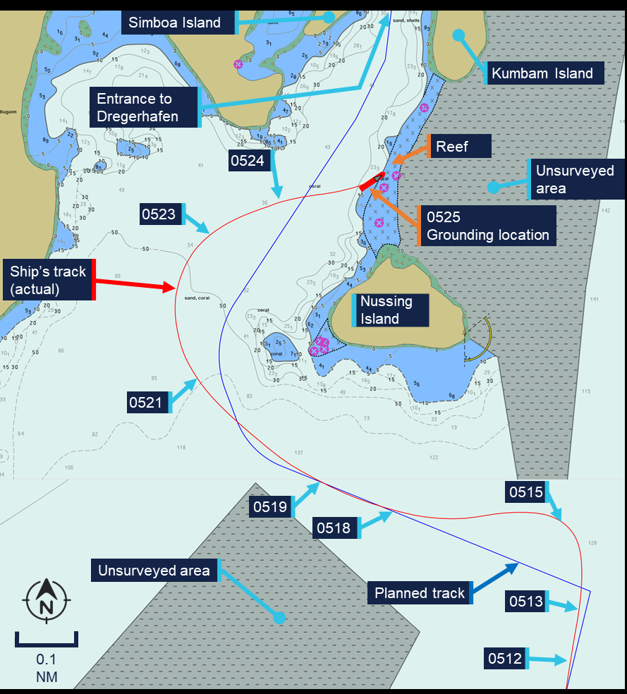 At 0524, the master arrived on the bridge, and visually spotted shallow water ahead; the ship grounded about 15 seconds after the master's warning. The Coral Adventurer came from 8.5 knots to a halt by 0525:30.