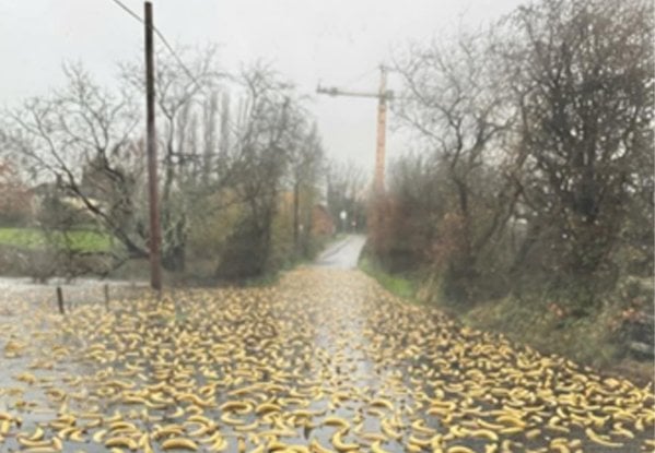 Due to the stormy and windy weather in the Selsey area, bananas have been swept off the beach into coastal roads, making for slippery driving conditions in some areas.