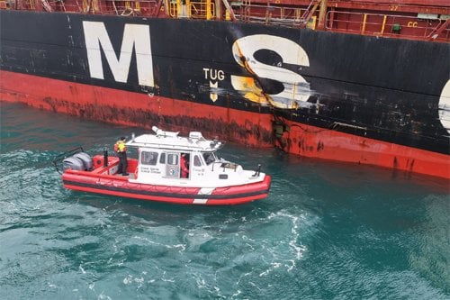 Reports are that two massive boulders penetrated the hull. Both the engine room and at least one of the cargo holds were penetrated and have flooded. The ship is 208 meters (680 feet) in length.