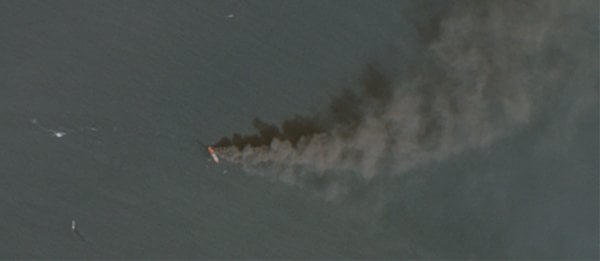abandoned ship drifting on fire in Persian Gulf