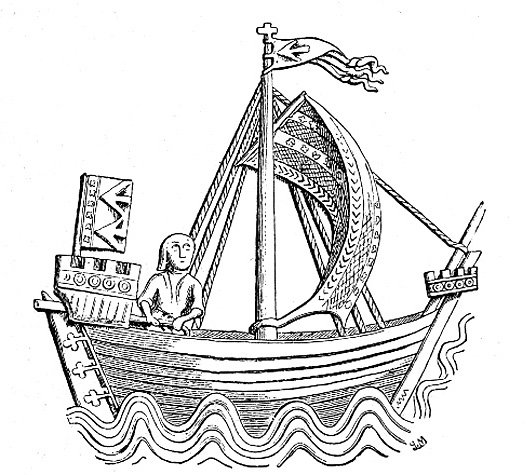 The medieval cog: Period illustration of a small cog from Stralsund, circa 1329 (Vrak)