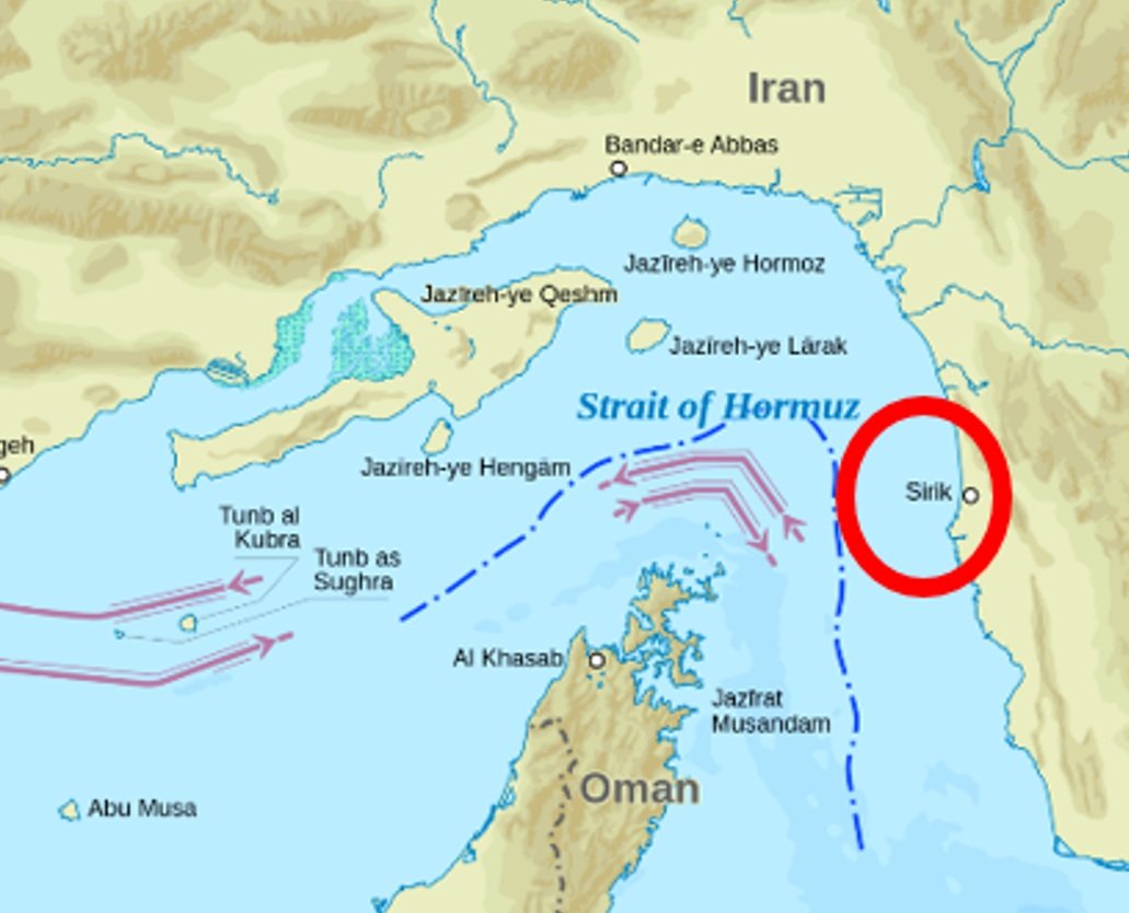 Strait of Hormuz Traffic Separation Scheme shipping channels (Goran Tek-en / CC BY), with the exercise area off Sirik indicated (CJRC).