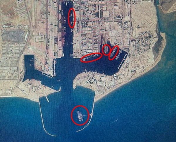 Frigates and long-range logistic vessels in a full Bandar Abbas Naval Harbor, early November 21 (Sentinel-2)