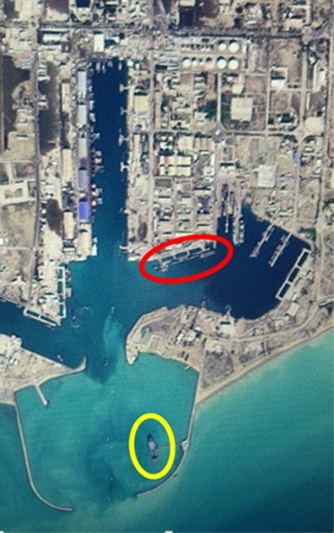 Bandar Abbas Naval Harbor, early December 23 (Sentinel-2/CJRC).  IRINS Kurdestan (K442) or Khuzestan (K443) (Yellow) and 2 x Alvand/Moudge and 2 x Bayandoor Class frigates (Red)