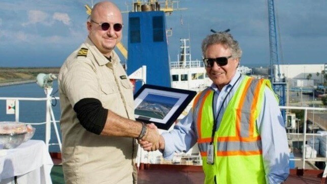 The first offload of 52,000 metric tons from the M/V Bulk Valor was celebrated with the traditional plaque exchange between the ship’s master, Capt. Enver Akcora, and Port CEO Capt. John Murray to welcome the crew on their inaugural visit to Port Canaveral.