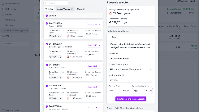 The partnership enables shipping companies to manage the full FuelEU lifecycle in one connected workflow - from forecasting and planning, to surplus trading and pool execution, through to monitoring compliance positions and pool validity.
