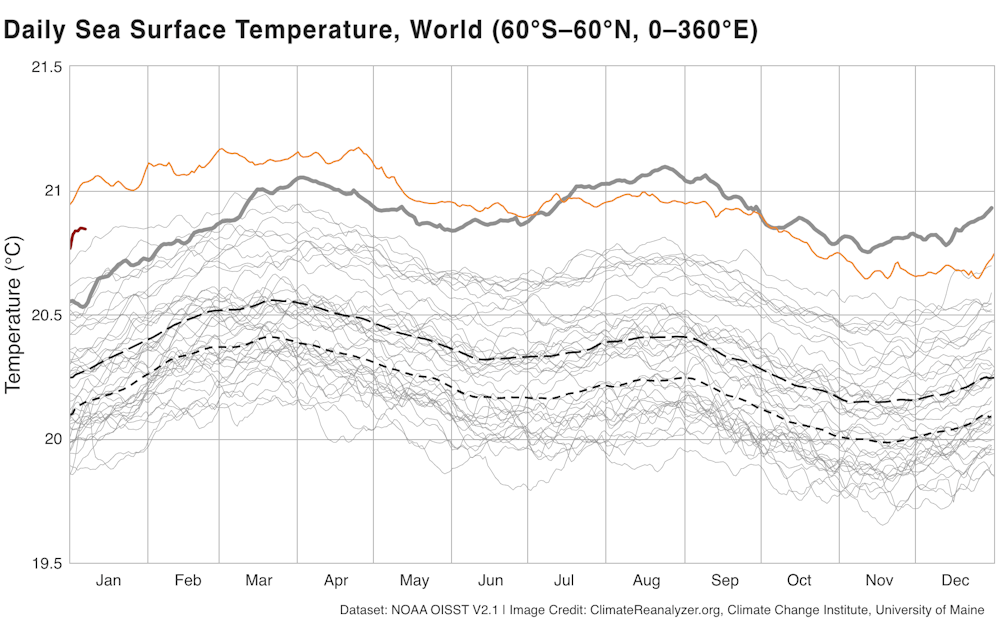 Sea surface temperatures have been running well above average when compared with all years on record, starting in 1981. The orange line is 2024, dark grey is 2023, and red is 2025. The middle dashed line is the 1982-2011 average. ClimateReanalyzer.org/NOAA OISST v2.1, CC BY