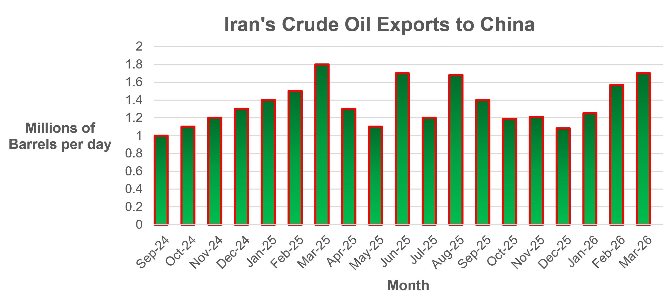For many years China has bought 80-90% of Iran’s total oil exports, with monthly volumes shown based on Kpler and Vortexa analysis (CJRC)