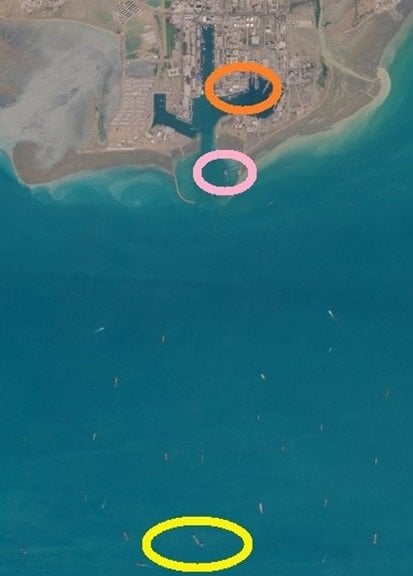 Bandar Abbas Naval Harbor, January 27. Orange: Empty frigate berths; Pink: IRINS Kurdestan (K442) present in Outer Basin, IRINS Makran (K441) absent, returning from Africa; Yellow: Shahid Bagheri (C-110-4) anchored as normal (Sentinel-2/CJRC)