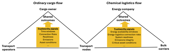 Building on the Trinity approach, the illustration below extends the coordination logic from ordinary cargo transport to a chemical flow transport system. While the same trustworthy signals - time windows, readiness, connection risks, emissions, and asset conditions - continue to sit between cargo owners, transport operators, and transport nodes, they are expanded to reflect energy availability and carbon integrity. In doing so, the model links transport execution directly to sustainable energy supply, ensuring that logistics flows are not only operationally aligned but also powered by verified low-carbon energy, without requiring the exchange of commercial data or contractual positions.