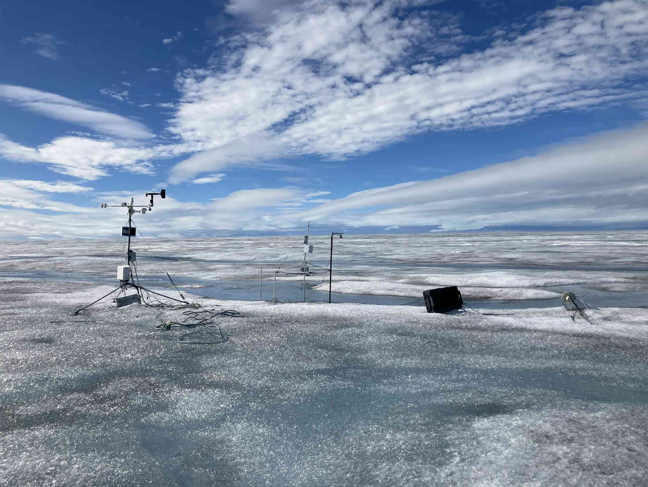 - Large tracts of the ice surface are undergoing bio-albedo darkening, which accelerates surface melt, as well as the impact of snow melting and refreezing at the surface. These darker surfaces absorb more solar radiation, driving yet more melt.
