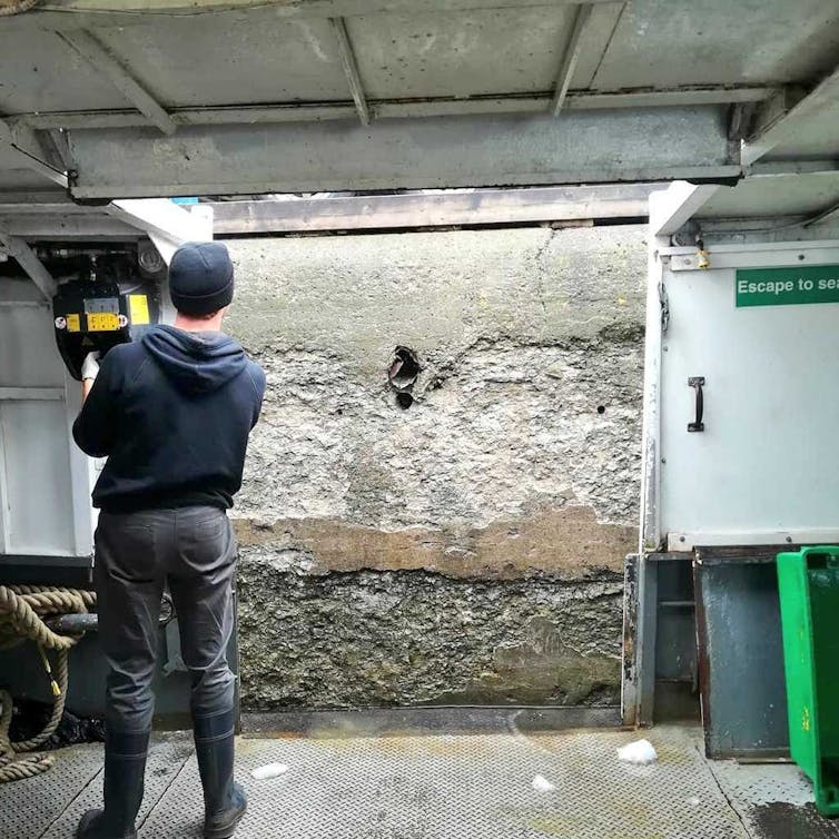 Landon Minor looks up the cement wall to where Paul Minor waits to unload a tote of yellow perch. The Minors must now unload up a vertical wall and over a railing in an active pedestrian walkway — an activity that will grow more dangerous in the summer months when they will share the walkway with tourists. (Hannah Harrison), Author provided