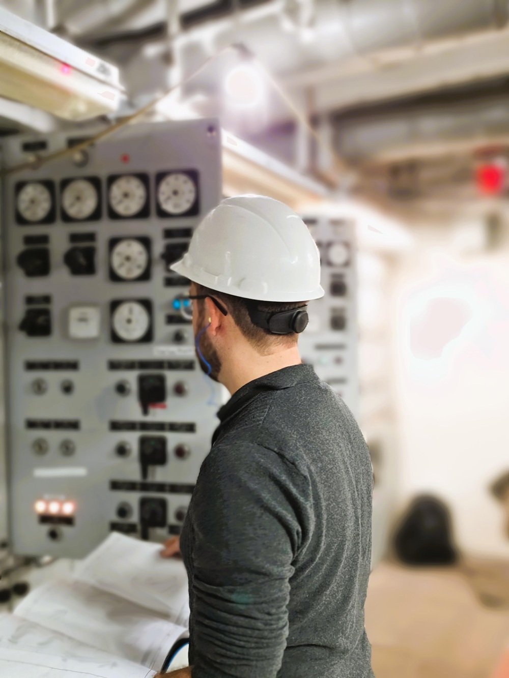 Boksa Marine Design's Marine Electrical Engineer Jordan Anger performs field verification on electrical upgrades to a switchboard.