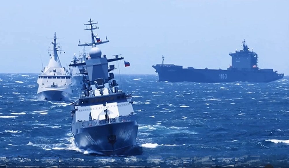 Russian corvette Stoykiy (F545), Emirati corvette Bani Yas (P110) and Nedsa IRIS Shahid Mahdavi (L110-3) take part in the sea-going phase of Exercise Will for Peace 2026 (PLA Navy video)