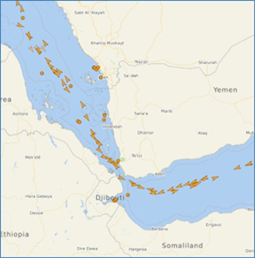 Tanker traffic in the southern Red Sea and Gulf of Aden, March 29 (VesselFinder)