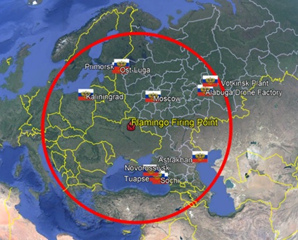 The Votkinsk Plant lies 800 miles from the Ukrainian border, implying the Flamingo's range is on the order of 1,000 miles. This puts all of Russia’s western oil-exporting ports in range, plus Kaliningrad, Caspian seaports (through which Iranian arms exports are reaching Russia), the Kerch Bridge to Crimea and also the highly-developed Russian internal sea canal network. Close by the Votkinsk Plant is the factory in the Alabuga Special Economic Zone producing Iranian-derived drones.