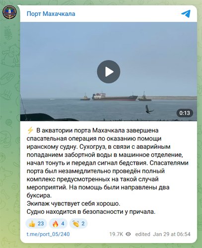 Officials at the port of Makhachkala on the western shore of the Caspian Sea reported that two tugs from Rosmorport had been dispatched to aid the vessel. They escorted the ship into port.