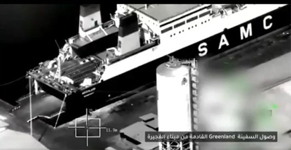 MV Greenland docked in Mukalla port, imaged by a Saudi surveillance drone (KSA Ministry of Defence)
