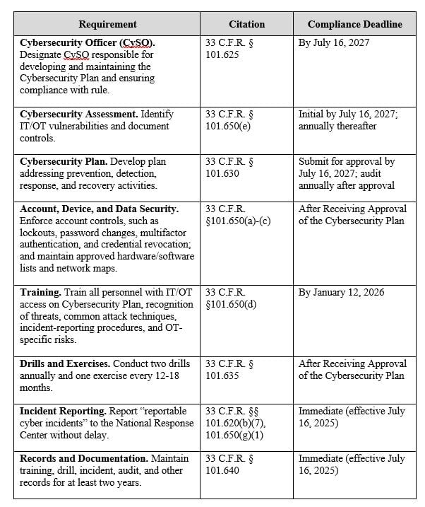 The USCG added a new subpart F to 33 C.F.R. part 101 that establishes minimum cybersecurity requirements. These requirements must be documented in a standalone Cybersecurity Plan or integrated into existing Facility or Vessel Security Plans. Some apply immediately, others on a phased schedule. Recognizing that vessels may face unique challenges, the USCG requested further comment on whether their compliance deadlines should be extended by 2–5 years. Any delay would not alter the immediate duty to report cyber incidents.