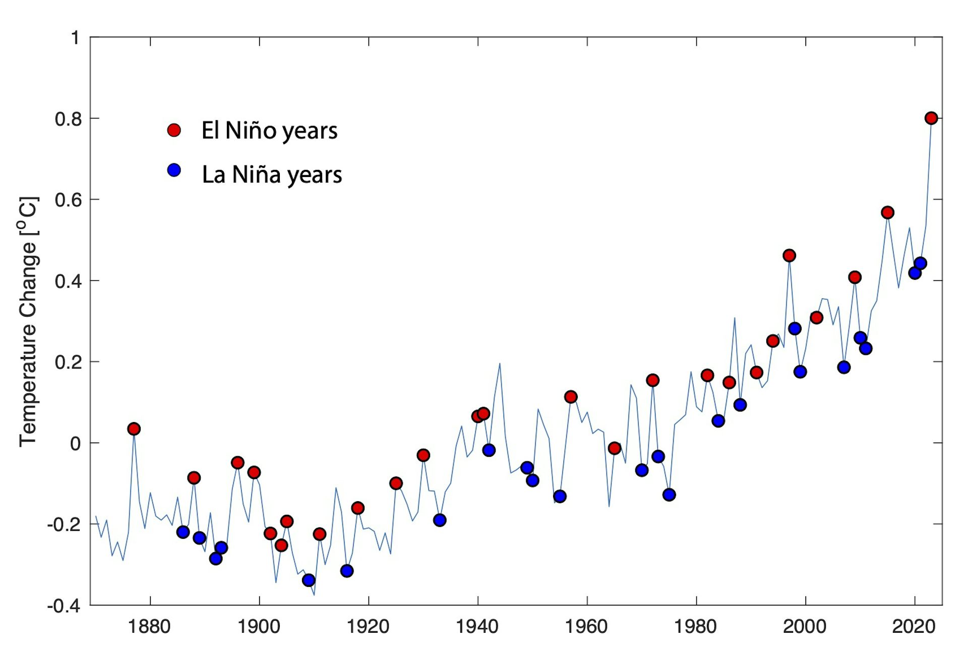 This figure shows global ocean temperatures with El Niño years (red dots) and La Niña years (blue dots) highlighted. Author provided