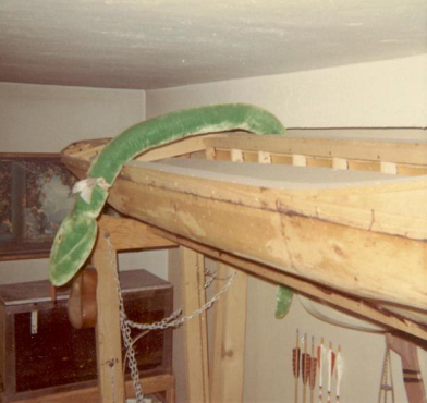 The hull and the two outriggers were made, and then this sailboat was put on a parallelogram rig that moved the boat to the middle of the bedroom when it was to be worked on, and up above the boys’ bed when it was stowed away for the night. The boat stayed in this room for years while the boy graduated from college, went to graduate school and got married.