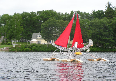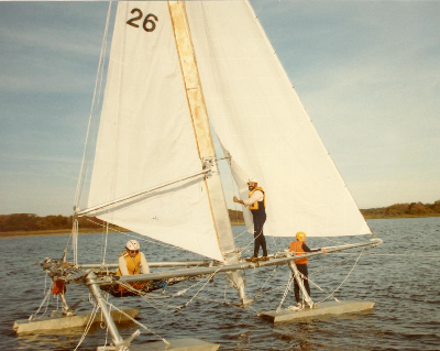 On June 19, 2005, (the man’s birthday), the Tridactyl Mark III model sailed with all functions operational. The latest ecto-rudder/ dagger board structure all worked as planned. The man was assisted by his two sons, Frank and Nick, and their children.