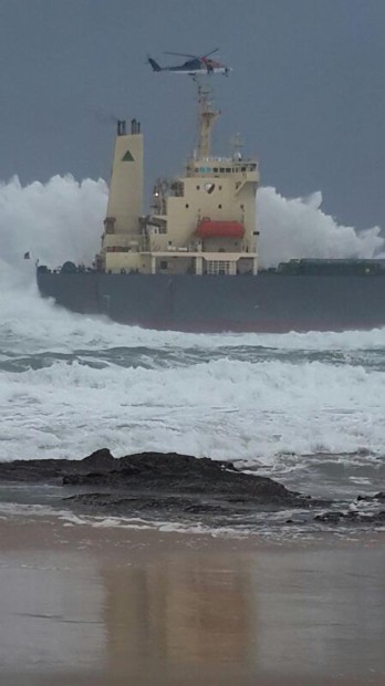 The ship had washed side on to the shore during the early morning and came to rest hard aground after her anchor dragged and the tug boat was not able to hold her off against rough sea swells of 5 meters and strong gusting to 45 knot onshore winds.. The decision was taken by the ship's Captain to abandon the ship and the safest method was to deploy the helicopter and hoist the crew off the ship while NSRI rescue boats stood by to assist if necessary.