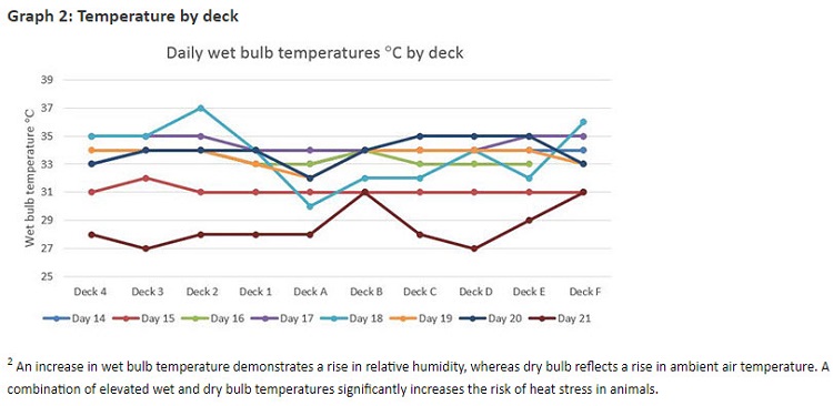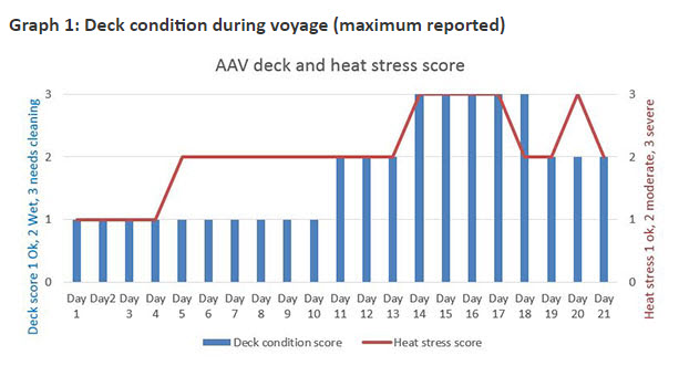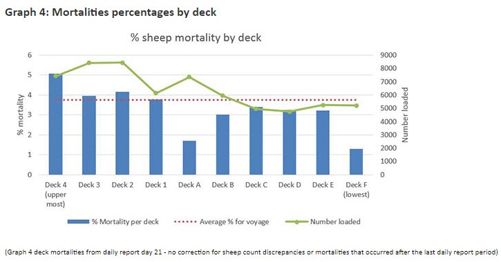 The Australian Department of Agriculture's investigation into the Awassi Express voyage concluded: “The cause of this reportable mortality was heat stress. The peak in mortalities corresponded with extreme heat and humidity experienced in Qatar. The humidity and temperatures experienced from day 5 to day 13 and associated deck conditions, prior to arrival in Qatar is likely to have contributed to the severity of the mortality event. The highest mortality rates were in the ‘A’ class wethers (69.43 kg), which were the fourth most numerous class of the sheep on board the ship making up 7.51 per cent of the consignment. There was no significant correlation of mortalities with deck position.