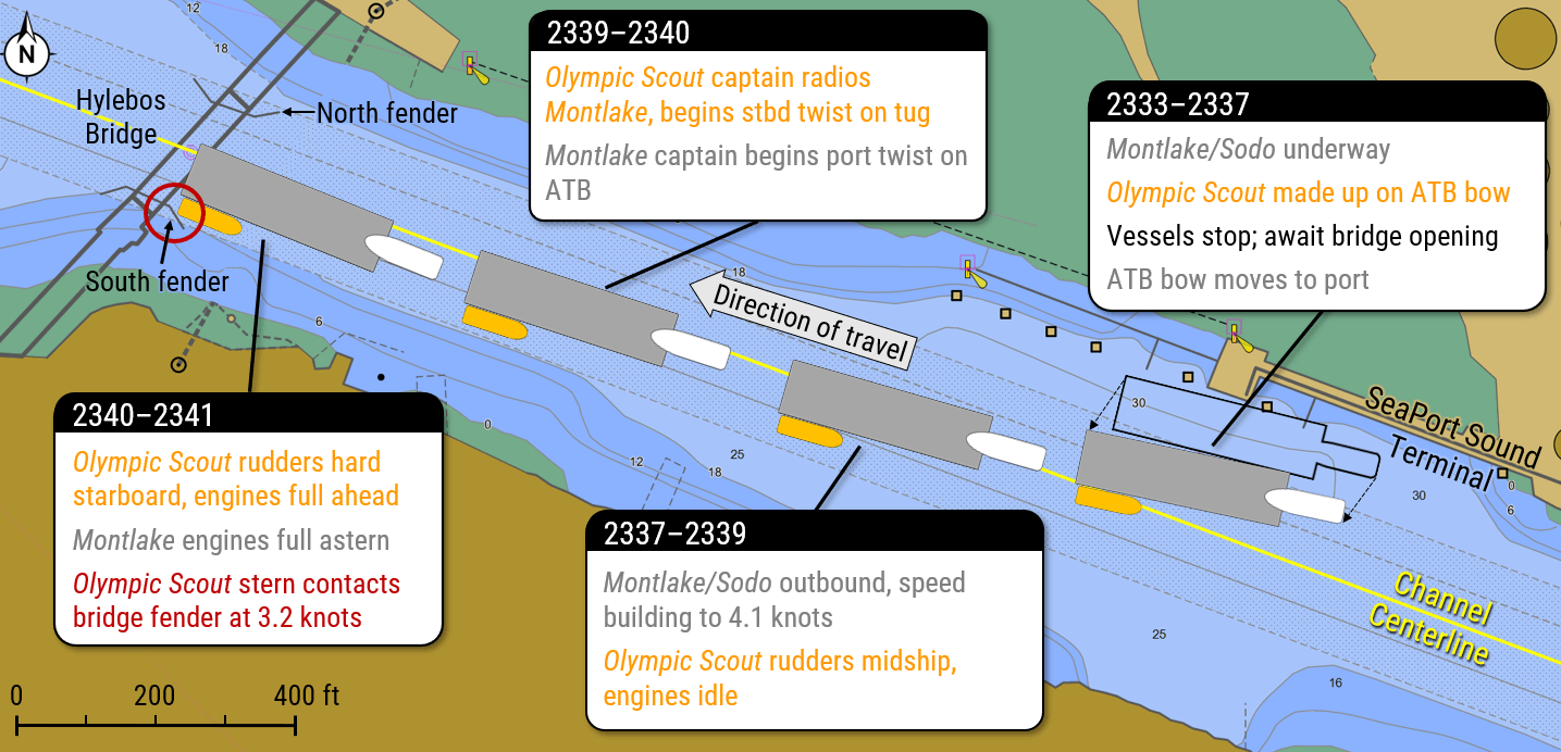 When the bridge opened at 2337, Montlake/Sodo resumed her outbound transit, building speed towards four knots. As they approached the bridge span, the ATB was set to port, towards the south side of the channel. Montlake's captain attempted to steer back to the middle of the channel, and as they got closer to the bridge, Olympic Scout's captain radioed to ask Montlake to maneuver to starboard to leave enough clearance for the assist tug to make it through the span. Montlake's captain instructed Olympic Scout's captain to "do what he needed to do" to get the ATB back to the center of the channel.