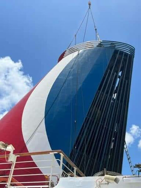 Carnival Cruise Line said that the funnel would be restored in the future when the vessel undergoes her next scheduled overhaul in dry dock. Reports indicate that the ship is not due for her next dry docking till 2024. She is also currently sailing without Carnival's newly introduced hull livery with a swooping blue section and red lines at the bow and the brand name on the ship's sides. They introduced the new livery on the Mardi Gras and have been adding it to the existing fleet as the ships are dry-docked.