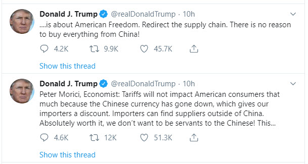Chinese state media quotes Qi Zhenhong, head of the China Institute of International Studies, a government think tank, saying that new tariffs by the United States on Chinese products will backfire and hurt the U.S. economy, but will not dampen Chinese development in the long run.