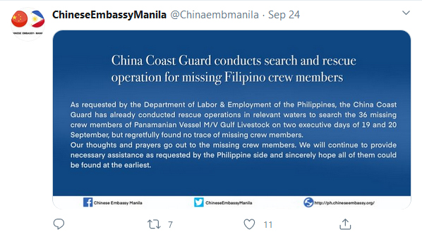 The Chinese Embassy in Manila issued a brief statement on September 24 reporting that its coast guard had conducted a search on September 19 and 20 as requested by the Philippine Department of Labor and Employment (DOLE). The statement said that they, “regretfully found no trace of the missing sailors. Our thoughts and prayers go out to the missing crew members. We will continue to provide necessary assistance as requested by the Philippine side and sincerely hope all of them could be found at the earliest.”