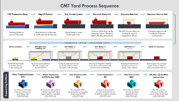 According to the company, the yard runs on its own power and produces clean steel, strongly related to green steel production. In addition to the steel, each ship would be separated into regular scrap, clean assorted non-ferrous, clean assorted inert materials, and the liquid and solid waste materials and processed at the CMT yard and converted into basic gasses to produce electricity, LNG and or H2.