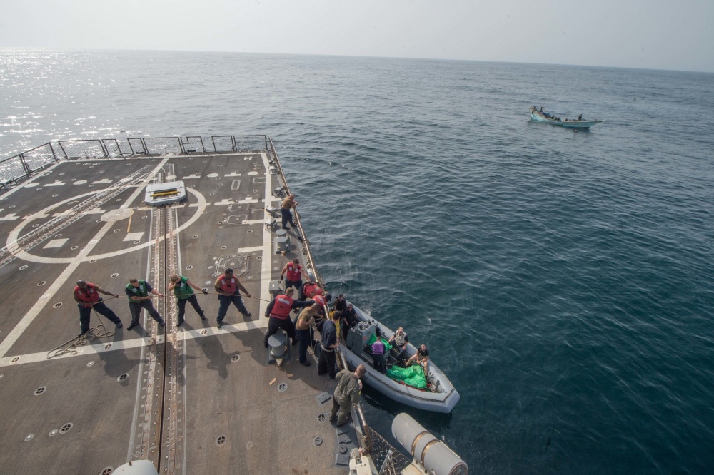The skiff's engines were inoperable, so the occupants were in distress. The Dunham's crew rescued them and brought them on board for transfer to the Yemeni Coast Guard, which is an element of the Saudi-backed national government of Yemen.