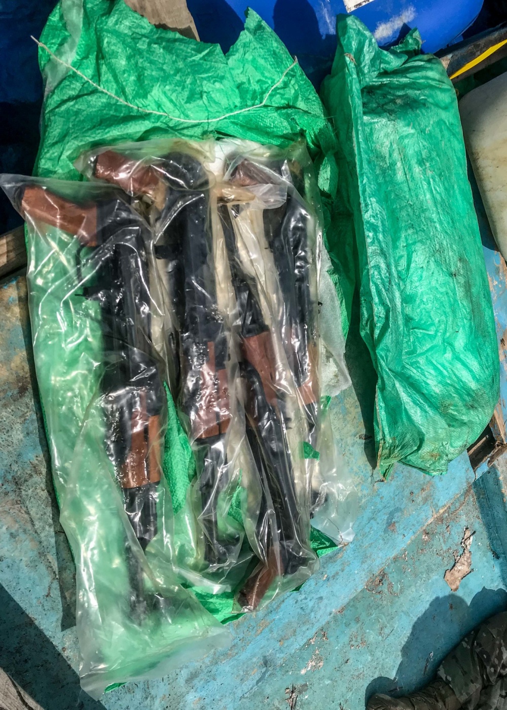 On Monday, the destroyer USS Jason Dunham encountered a dhow transferring covered packages to a skiff in the Gulf of Aden, which lies between Yemen and Somalia. The following day, a team from the Dunham boarded the skiff in international waters and determined that it was stateless. Upon a search, the team found more than 1,000 AK-47s on board.