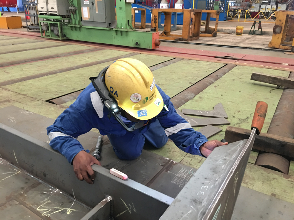 Sembcorp Marine Quality Control inspector working with helmet mounted camera and communication device