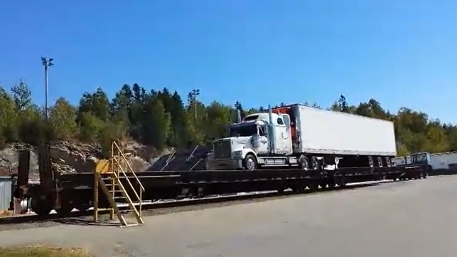 The cargo is then loaded into truck trailers and driven onto a two-car, one-track train, the Bayside Canadian Railway (BCR). This miniature onsite rail line carries each laden truck 100 feet to the south, then 100 feet back north, completing a round-trip "Canadian rail journey." From the BCR's loading ramp. the truck drives over the border into Maine, completing a 7,500 nm foreign-flag cargo shipment between U.S. points.