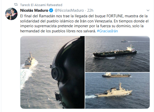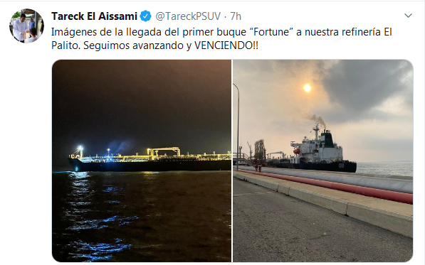 Venezuela celebrated the arrival with a series of Tweets, writing, “Images of the arrival of the first “Fortune” ship at our El Palito refinery. We keep moving forward and WINNING !!” Venezuelan President Nicolas Maduro also thanked Iran in a Tweet for its support of his nation.