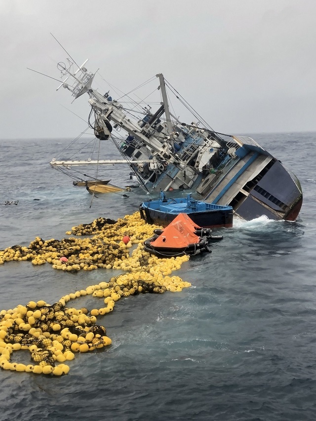 A boat crew from a Coast Guard cutter quickly rescued 16 of the fishing vessel crew and Coast Guard members while 20 others climbed up nets hung from the side of the cutter. One Marujita crewman clung to the hull of the sinking vessel until he was rescued by the cutter’s rescue swimmer.