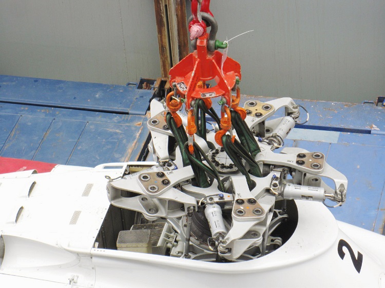 The helicopter rigging is a single shackle attachment for the four lift-wires (polyester round slings) fitted to the container spreader to be employed by each respective terminal. The round lifter, 6.5 meter SWL, was rigged with five nylon belts tied on the rotor hub which had no locking mechanism and thus remained free to rotate, relative to the helicopter.