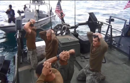 Iranian state television released footage of the arrest, showing the sailors as they knelt down with hands behind their heads and their two vessels being surrounded by several IRGC fast boats.