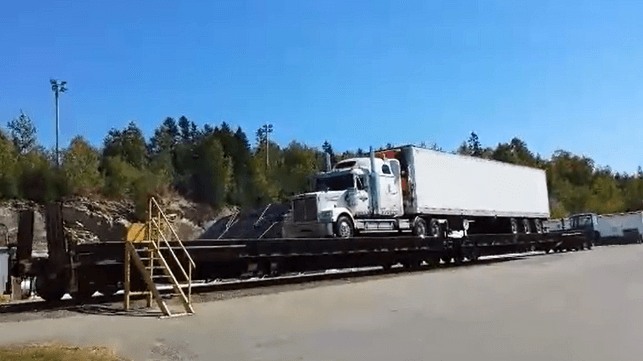 The cargo is then loaded into truck trailers and driven onto a two-car, one-track train, the Bayside Canadian Railway (BCR). This miniature onsite rail line carries each laden truck 100 feet to the south, then 100 feet back north, completing a round-trip "Canadian rail journey" (video at top). From the BCR's loading ramp, the truck drives over the border into Maine, finishing a 7,500 nm foreign-flag cargo shipment between U.S. points.