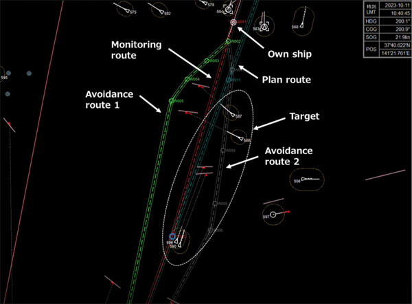 During the demonstration sea tests, they were able to confirm the recognition, analysis, and decision-making capabilities of the autonomous navigation system. The system was used to navigate while maintaining the normal crew navigation tasks, and in situations where avoidance was necessary. They report that the autonomous navigation system proposed avoidance routes and controlled steering to safely avoid other vessels.