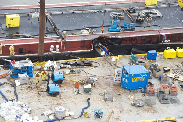 Damaged barge after the 2014 collision (US Coast Guard photo)