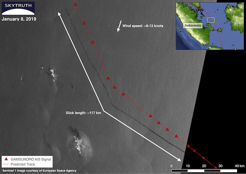 In another example, SkyTruth obtained imagery in January showing a similar linear slick off Indonesia's Bangka Belitung Islands. This slick had a sharp bend in the middle, which lined up well with the AIS trackline of an Indonesian oil tanker, the Gamsunoro. About eight hours before the image was taken, the tanker had passed about 5 km upwind of the slick and parallel to it, and her track closely approximated the same bend (with a change of course).