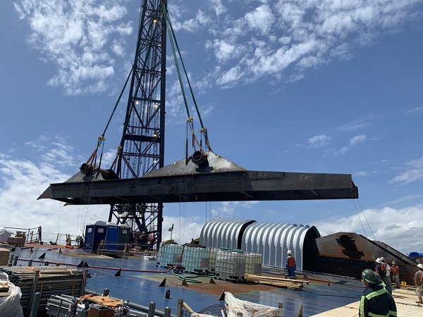 The first 36-inch diameter high-density polyethylene (HDPE) floating pipe barrier segment was installed around the wreck last month. The environmental protection barrier is being built by Weeks Marine. The HDPE pipe, which is foam filled and one of 36 segments in total, will float on the water surface between steel buoys constrained by the structural framing at each pile group. The HDPE barrier will secure and protect a floating offshore oil boom that will be installed outside of the pipe and will completely surround the wreck site.